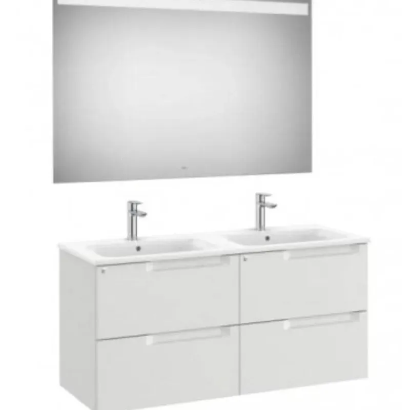 Conjunto de baño doble con mueble suspendido con 4 cajones, 2 lavabos y espejo con luz LED The Gap Roca