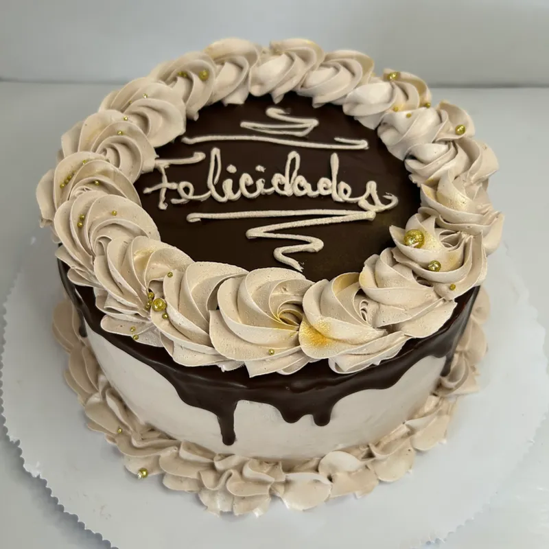 Un pastel esponjoso cubierto con una nube de merengue suave y brillante, coronado con un seductor baño de chocolate que se desliza lentamente por los bordes. Simple, elegante y perfecto para cualquier ocasión.