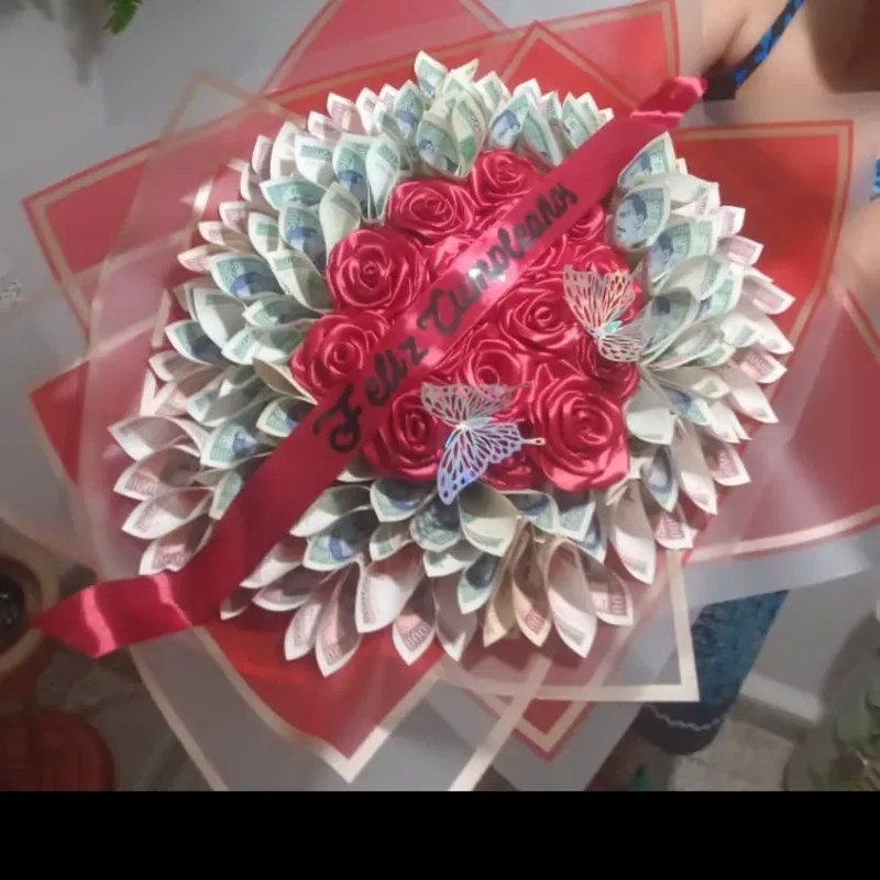 Este ramo de rosas eternas se le puede añadir dinero ,según la cantidad de billetes es el precio ( son traidos por el cliente ) se hacen con dolares o moneda nacional,