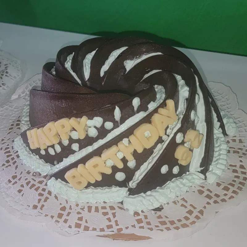Cake con doble relleno. Cubierto con 1lb de chocolate y personalizado