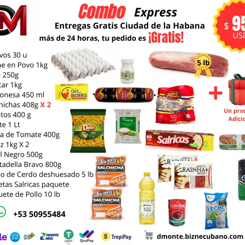 Huevos 30 u Leche en Povo 1kg Café 250g Azúcar 1kg Mayonesa 450 ml Salchichas 408g X 2 Coditos 400 g Aceite 1lt Pasta de Tomate 400g Arroz 1kg X 2 Frijol Negro 500g Mortadella Bravo 800g Lomo de Cerdo deshuesado 5 lb Galletas Salricas paquete Paquete de Pollo 10 lb + Un producto adicional.