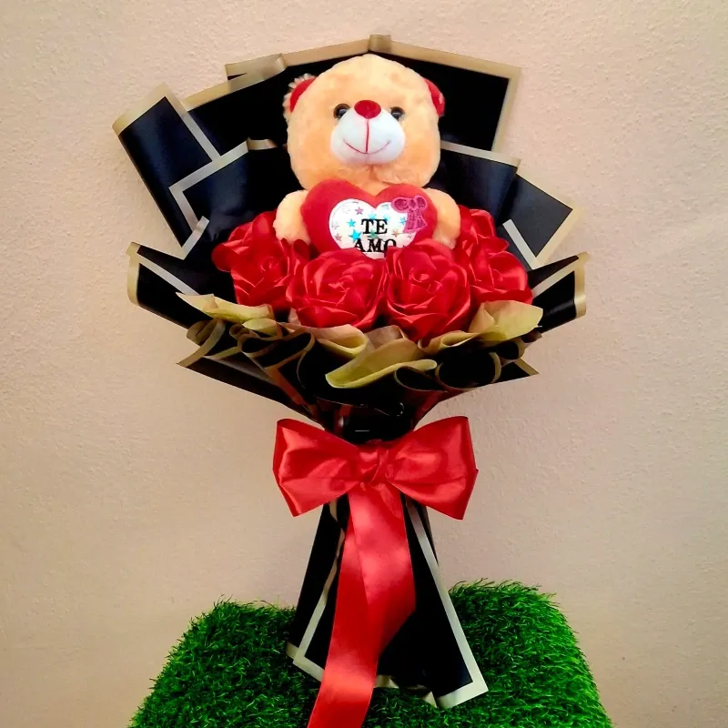 Flores que enmarcan un adorable peluche. Fusiona la belleza efímera de la naturaleza con la ternura de un compañero de felpa.