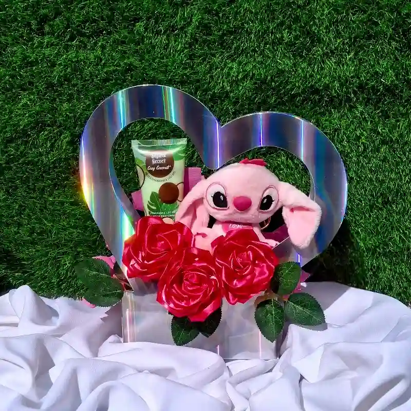Peluche y crema corporal en estuche con forma de corazón, adornado con flores eternas. Un detalle que habla del amor a través del tacto suave y la piel consentida.