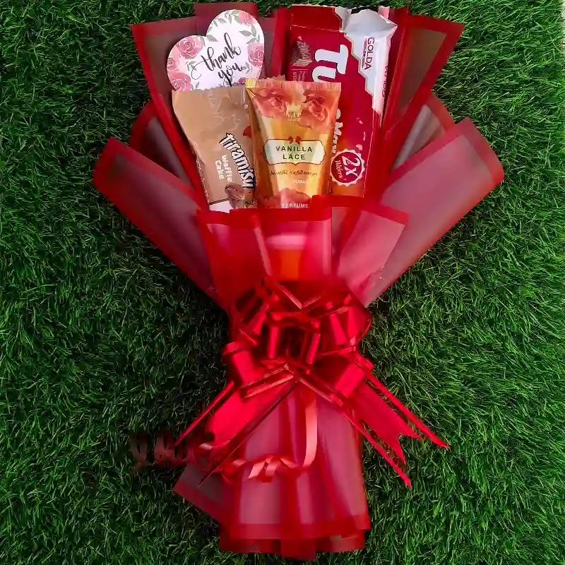 Crema corporal y confituras presentadas en forma de ramo. Para que tu regalo sea memorable