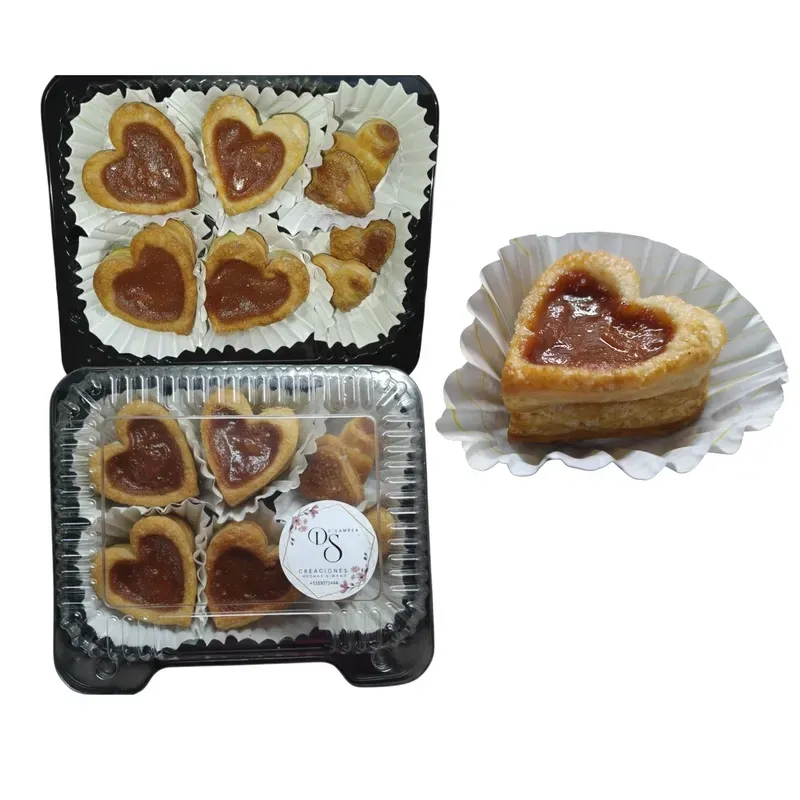 Caja artesanal de 8 piezas: incluye 4 pasteles de hojaldre (también conocidos como pasteles de hoja) en forma de corazón de 5.5 cm con relleno de guayaba, y 4 mini pastelitos de 3.5 cm presentados en capacillos que realzan su delicadeza y atractivo visual. Un set equilibrado y encantador, elaborado con cuidado artesanal y pensado para compartir momentos especiales con un detalle dulce y elegante.
