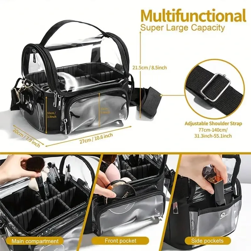 Bolsa organizadora de cosméticos con cierre superior con cremallera. Gran espacio de almacenamiento más los bolsillos delanteros y traseros para accesorios, diseño transparente para facilitar su búsqueda y acceso rápido a lo que necesita.