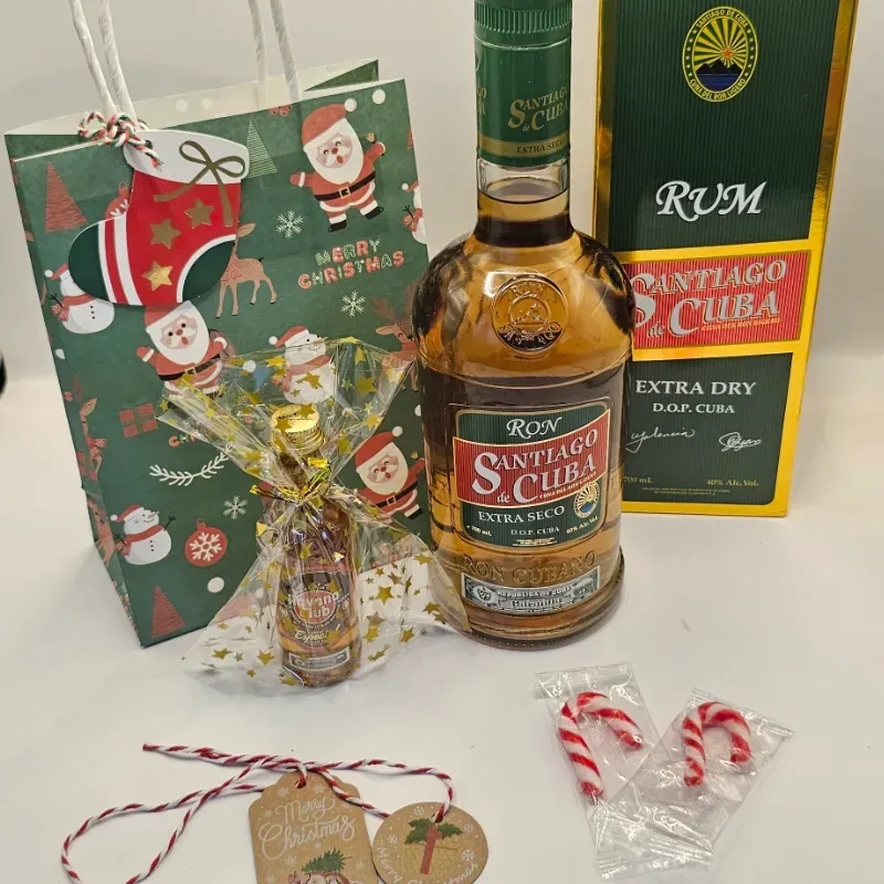 Incluye : 1 Bolsa de regalo temática navideña 2 etiquetas navideñas 1 Minidosis Havana Club Añejo especial 4 Caramelos navideños