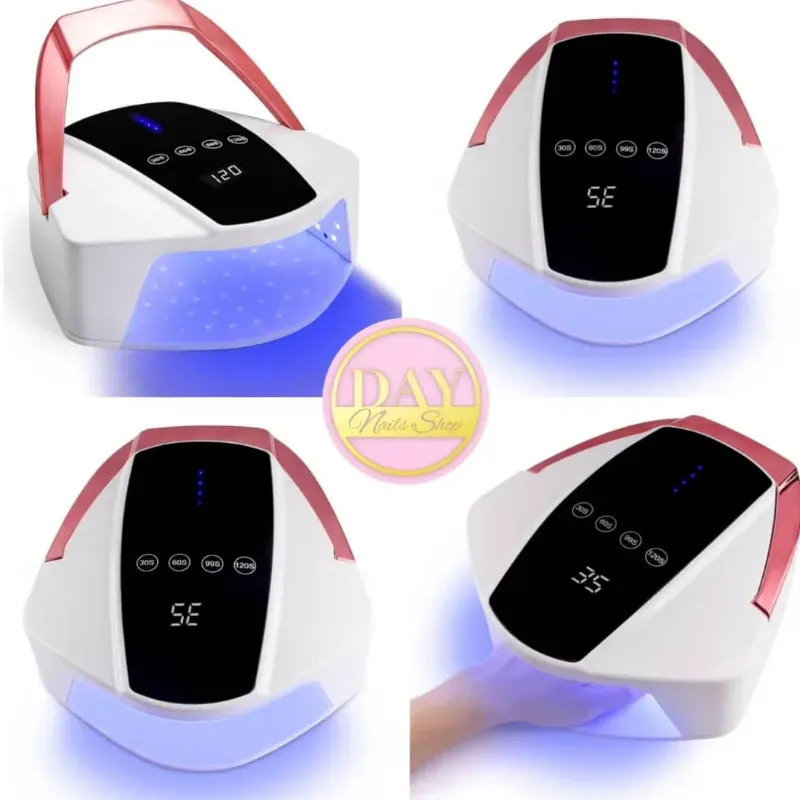 96 W de potencia. Duración de 8 horas de uso continuo. 48 pcs leds. Disipador interno de calor. 4 temporizadores (30 60 99 y 120 segundos). Panel táctil y con sonido. Posee puerto usb para abastecer de carga celulares, lamp soft gel, ect... mango portatil y sensor infrarrojo automático. Base extraíble, util para pedicure.