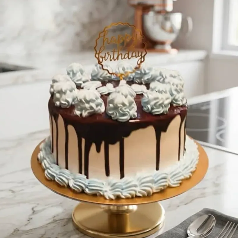 Cake de 20 cm masa vainilla relleno de su preferencia con baño de cobertura chocolate.