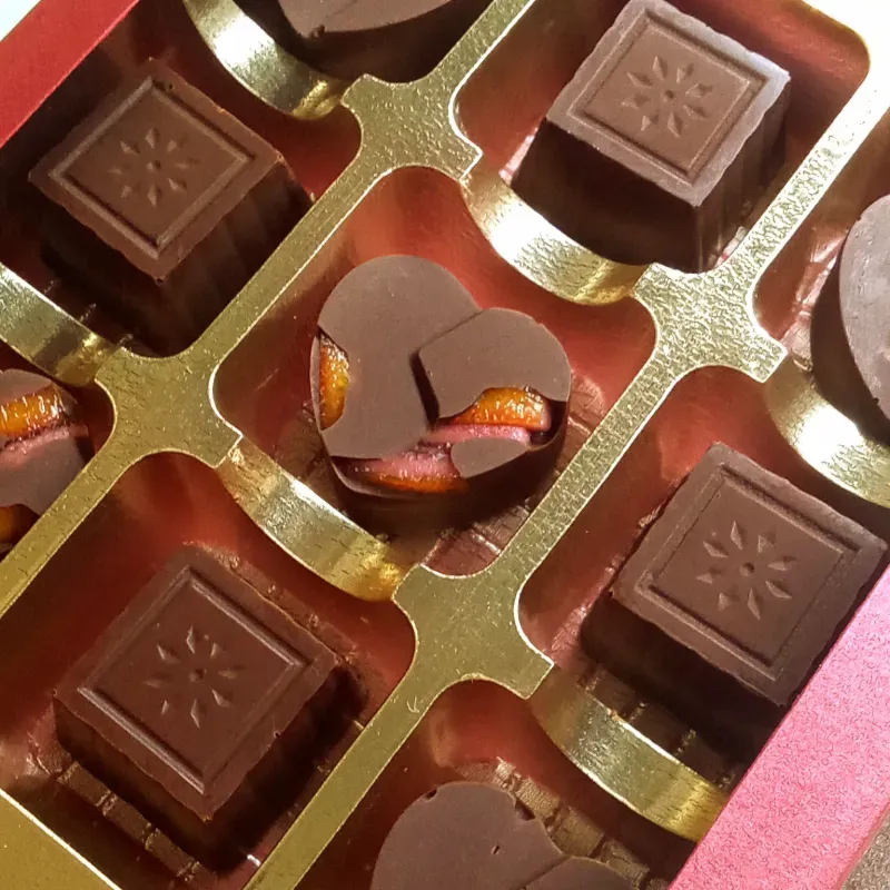 Bombones de chocolate semiamargo rellenos con naranja confitada