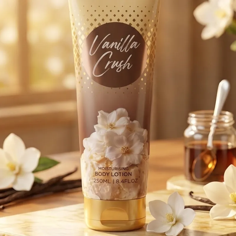 una deliciosa fórmula hidratante que fusiona la calidez de la vainilla pura con notas de azúcar caramelizada y un delicado toque floral para brindarte una hidratación profunda con un aroma dulce y elegante que te envuelve durante todo el día.