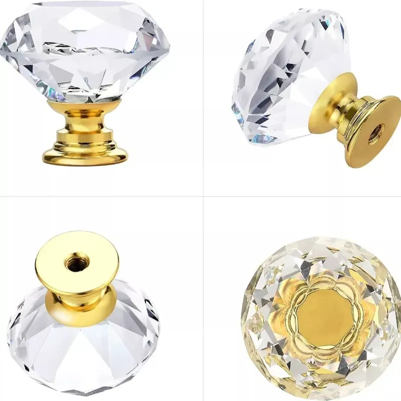 Jaladera de Cristal Forma Diamante con base dorada. Brillantes y elegantes