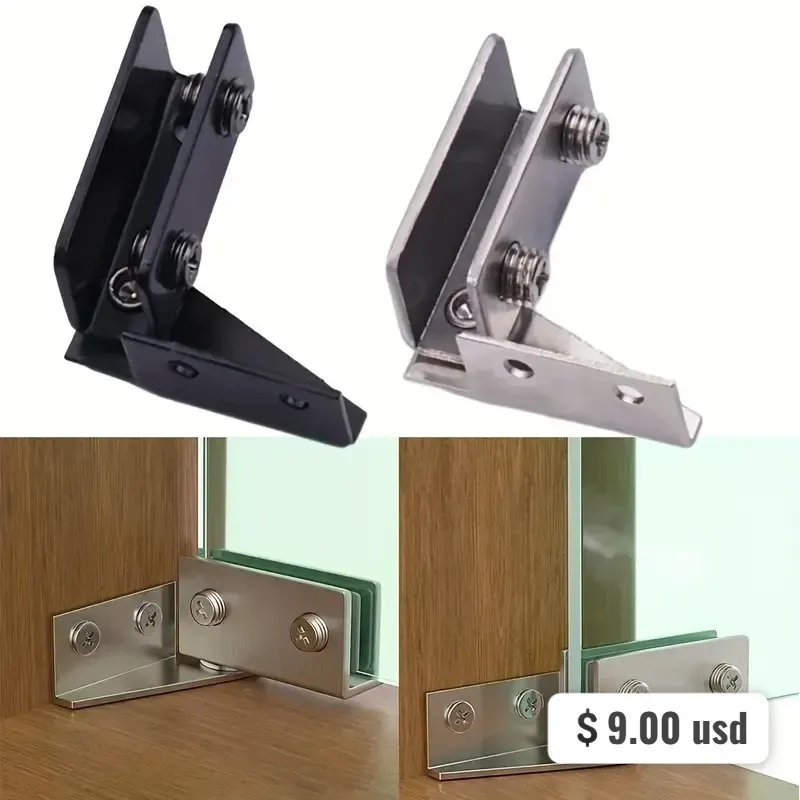 【Bisagra de puerta de vidrio no perforada】Hecha de acero inoxidable/acero laminado en frío, esta bisagra está diseñada para puertas de vidrio o acrílico de 5-8mm. Es perfecta para reforzar y ensamblar vidrio en vitrinas, contenedores, acuarios, etc. El tornillo ajustable permite un ajuste seguro.