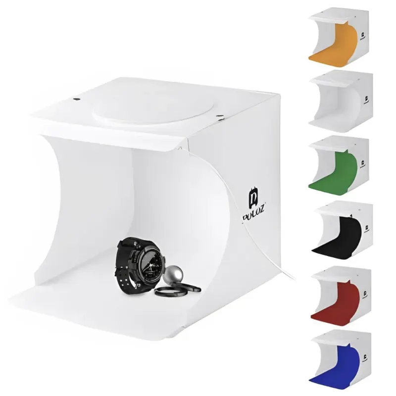 Fondos intercambiables de varios colores: Incluye 6 fondos de colores (blanco, negro, rojo, azul, verde y naranja) que se pueden cambiar fácilmente según el tipo de producto o efecto deseado. Esto permite mayor versatilidad al momento de crear contenido visual profesional.