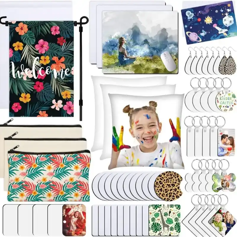 Kit de iniciación de sublimación de 128 piezas] El paquete de espacios en blanco de sublimación de sublimación incluye un juego más completo de productos de sublimación en blanco caliente, incluyendo 1 manual de instrucciones , 3 bolsas de maquillaje, 5 calcomanías para nevera, 5 imanes suaves, 2 banderas de jardín, 2 rompecabezas, 3 alfombrillas de mouse, 3 fundas de almohada, 10 posavasos cuadrados, 20 llaveros, 2 hierro. anillos, 20 x plástico Hebillas, 8 aretes, 8 ganchos para las orejas, 8 anillos de cierre. 💲95 usd