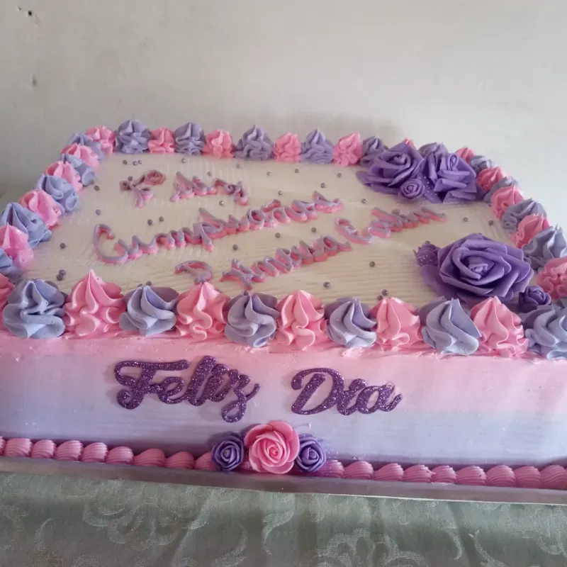 Pastel rectangular de dimensiones 44x34cm y 10cm de alto. El merengue, relleno y cobertura se realiza en correspondencia a lo que desee el cliente y la disponibilidad que haya en el momento del pedido. Así como la personalización del pastel.