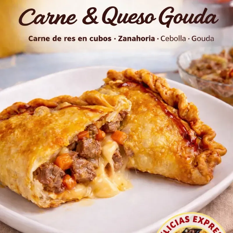 Empanada rellena de carne de res en cuboa, zanahoria, cebolla y queso gouda.