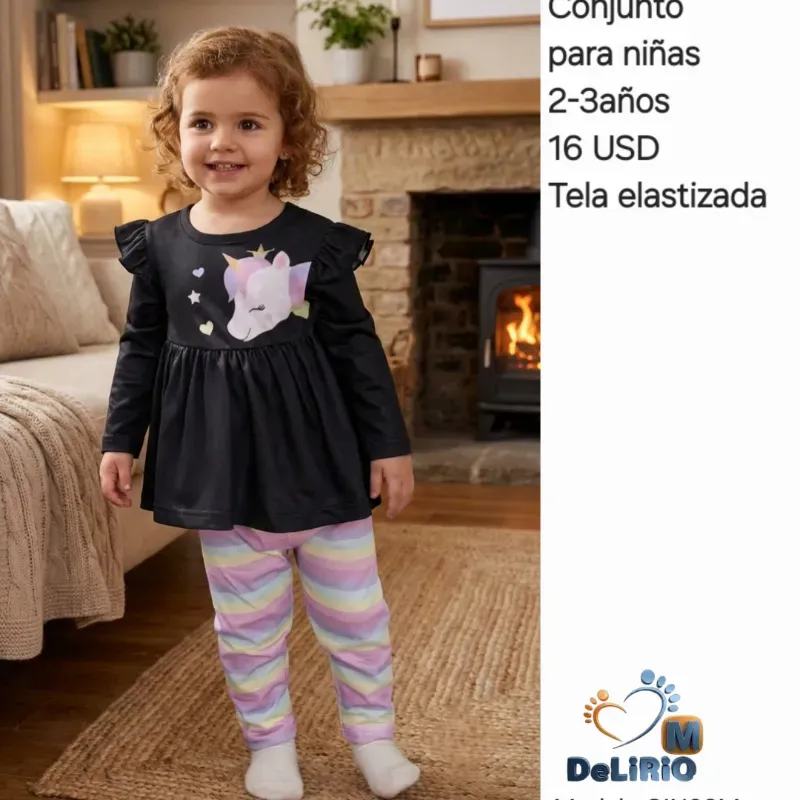 🦄 Diseño: Enguatada elastizada negra con estampado de unicornio y volantes + pantalón a rayas pastel.