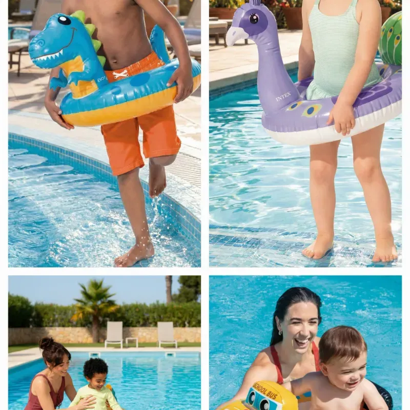 Anillos de animales divertidos: Un anillo de dinosaurio 🦖 azul y amarillo, y un anillo de pavo real 🦚 lavanda para niños más grandes. Asientos de natación para bebés: Un asiento de natación de coche 🚓 y un asiento de natación de autobús escolar 🚌 para los más pequeños.