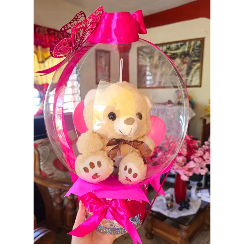 Arreglo de globo burbuja con peluche dentro