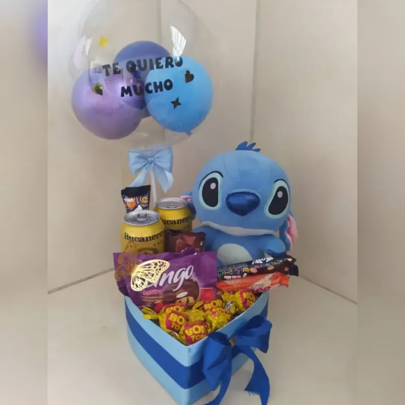 Cajita con stich, bombones , malta y confituras