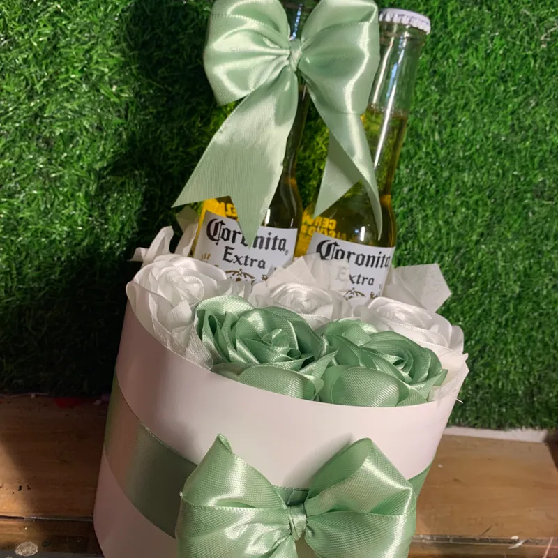 Cesta con 5 rosas eternas y 2 cervezas corona
