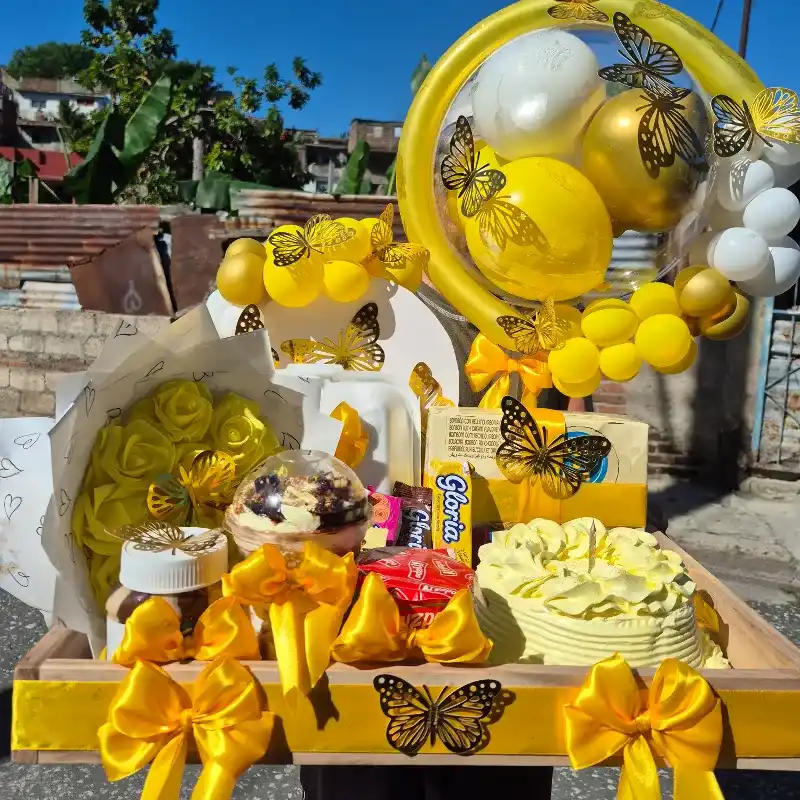 Bandeja con decoracion perzonalizada Arco de globos Globo burbuja perzonalizado Cake Caja de bombones o chocolates Domo 3 leches Nutella Pringles Combo de confituras Ramo de rosas eternas perzonalizado Termopack de donas
