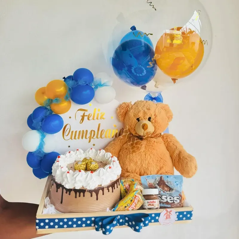 Bandeja decorada Perzonalizada al gusto del cliente Cake Globo burbuja Arco de globitos Peluche Combo de confituras Nutella
