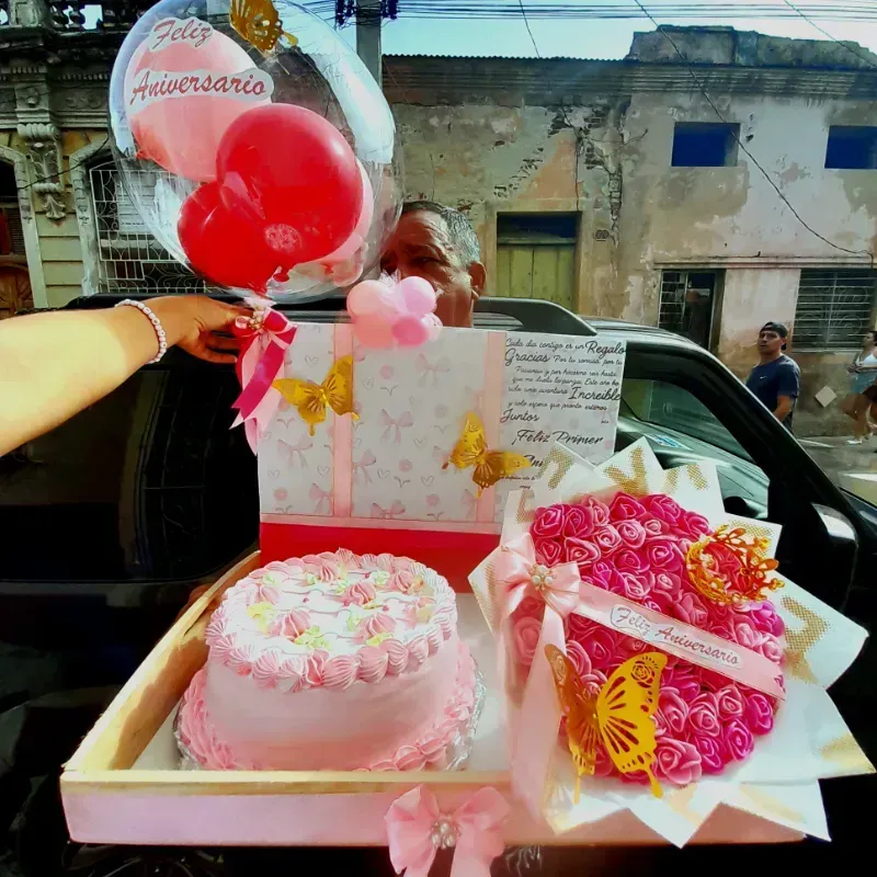 Bandeja sorpresa decorada con el color, tematica y decoración personalizada ✅️ Esta bandeja incluye : ✅️ ramo de de rosas eternas ✅️ combo de 10 confituras ✅️ cake ✅️ Globo burbuja + globitos