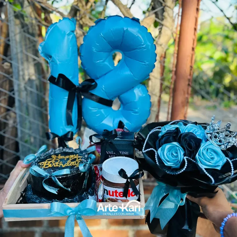 Bandeja perzonalizada con globos de números y color perzonalizado por el cliente Cake temático Nutella Perfume Ramo de rosas eternas Combo de 10 confituras