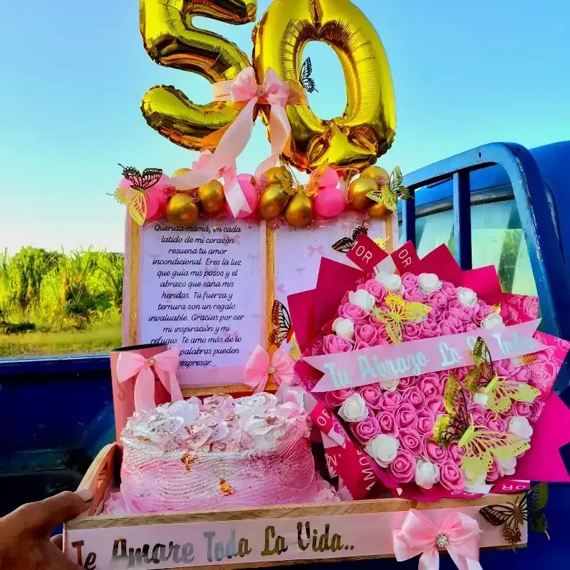 Bandeja grande perzonalizada Decoracion perzonalizada a su gusto Globos de números mas globitos Cake Ramo de rosas eternas perzonalizado Taza perzonalizada Perfume Botella de sidra