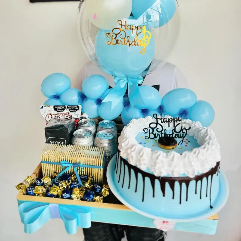 Bandeja con globitos Globo burbuja 4 cervezas Perfume Combo de confituras Cake