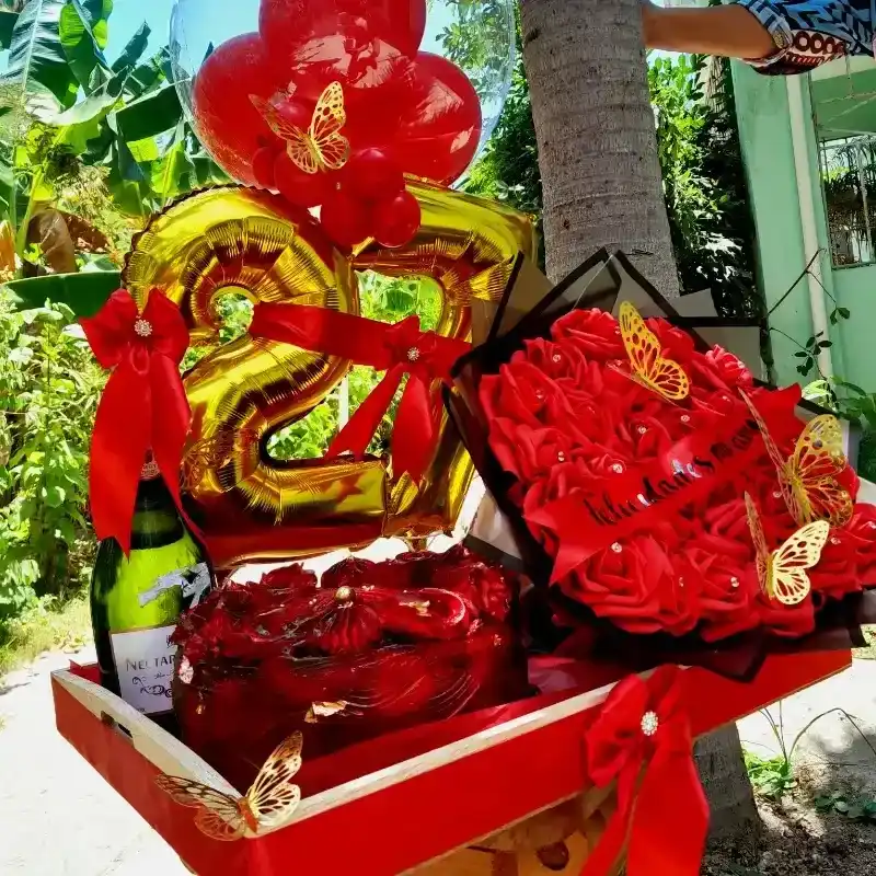 Bandeja con decoracion perzonalizada Globos de números Globo burbuja Cake Ramo de rosas eternas Botella