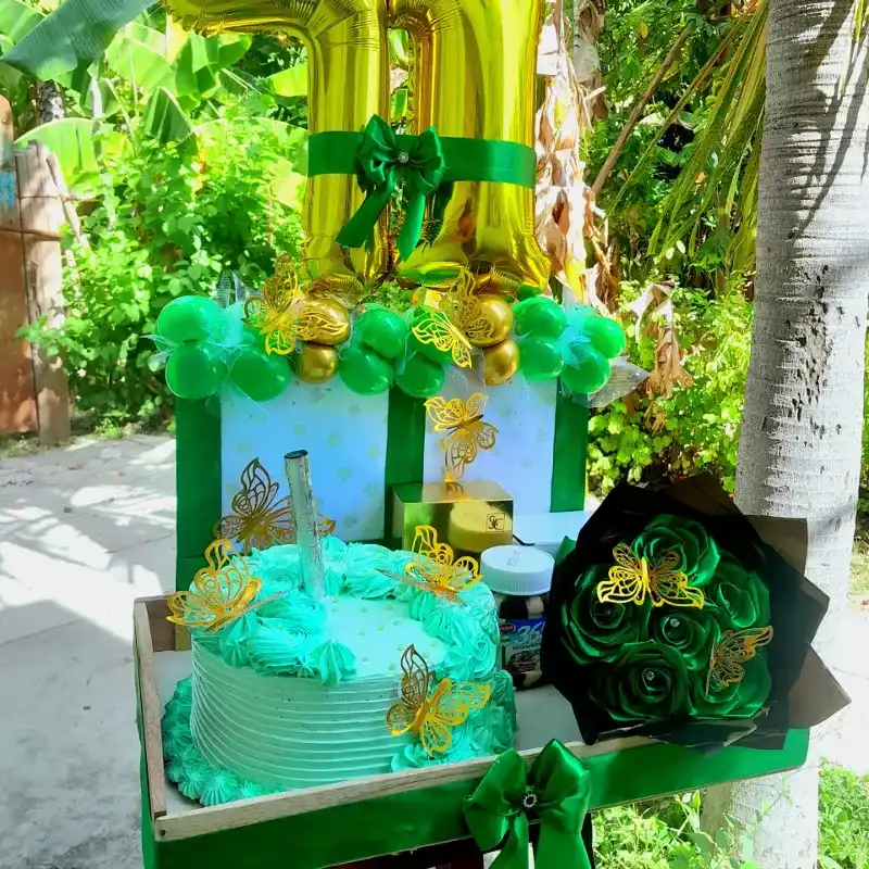 Bandeja con decoracion perzonalizada al gusto del cliente Fondo perzonalizado con globitos Cake Perfume Nutella Taza perzonalizada Globo de numeros Ramo de Rosas eternas