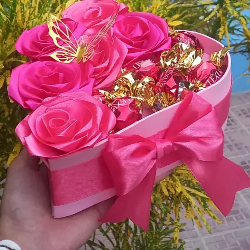 El arreglo incluye 6 rosas eternas, 10 bombones, mariposas decorativas.