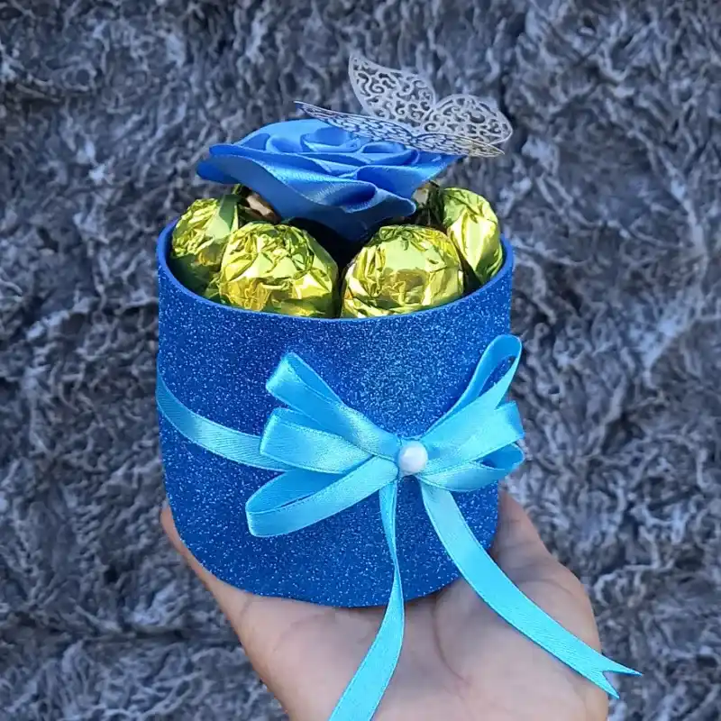 El arreglo incluye 1 rosa eterna, mariposa decorativa, 7-8 bombones. 📌 Personalizable al gusto del cliente. 📌 Si desea bombones Ferrero Rocher el precio varia.