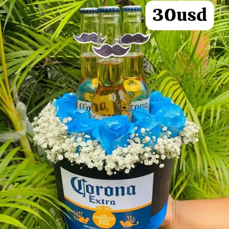 Caja con cerveza y flores