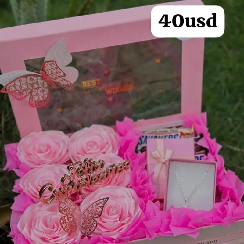 Caja con flores y cadena mas confituras