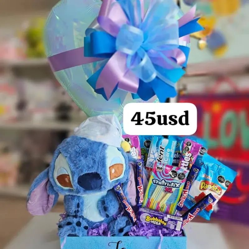 Caja de peluche con globo y confituras