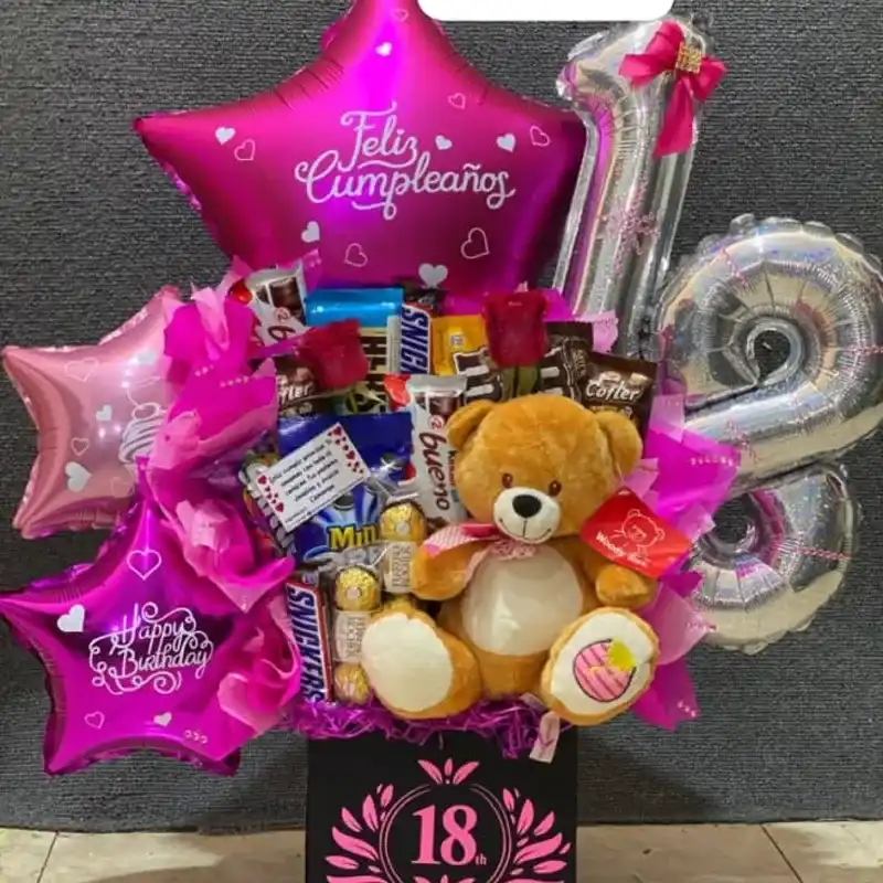 Caja feliz cumpleaños con confituras y globos