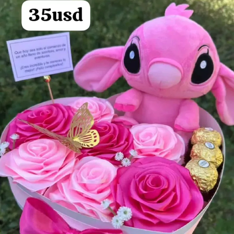 Cajas sorpresa con bombones originales, peluche stich y decoracion de rosas