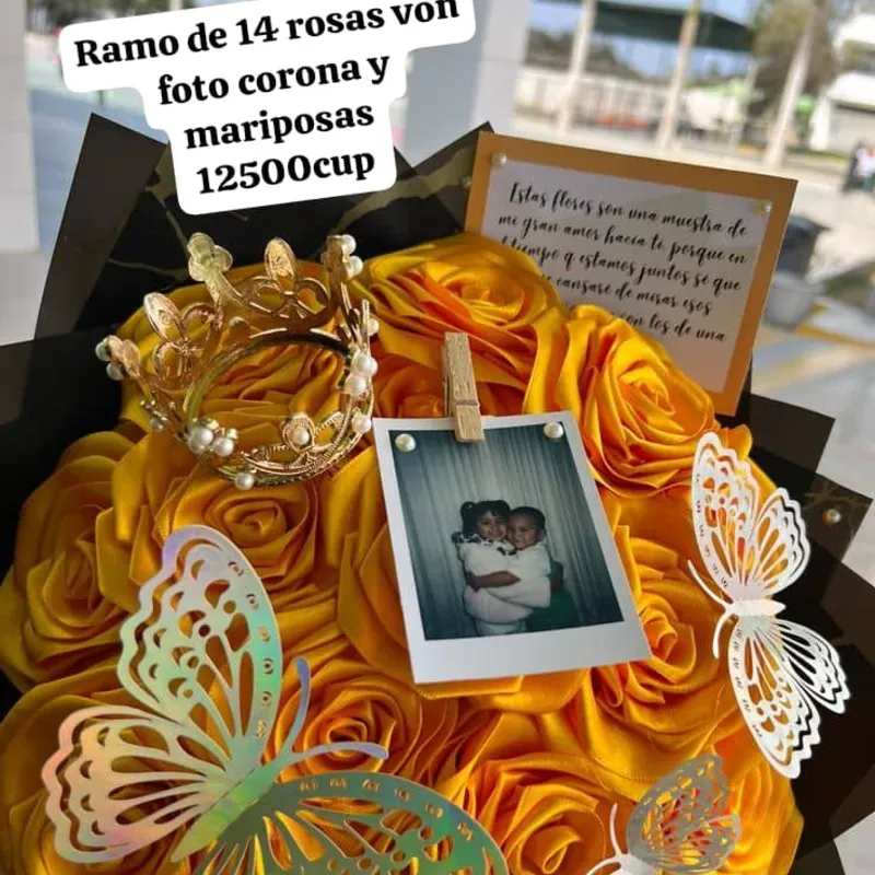 Ramo de 14 rosas con foto, mariposa y corona