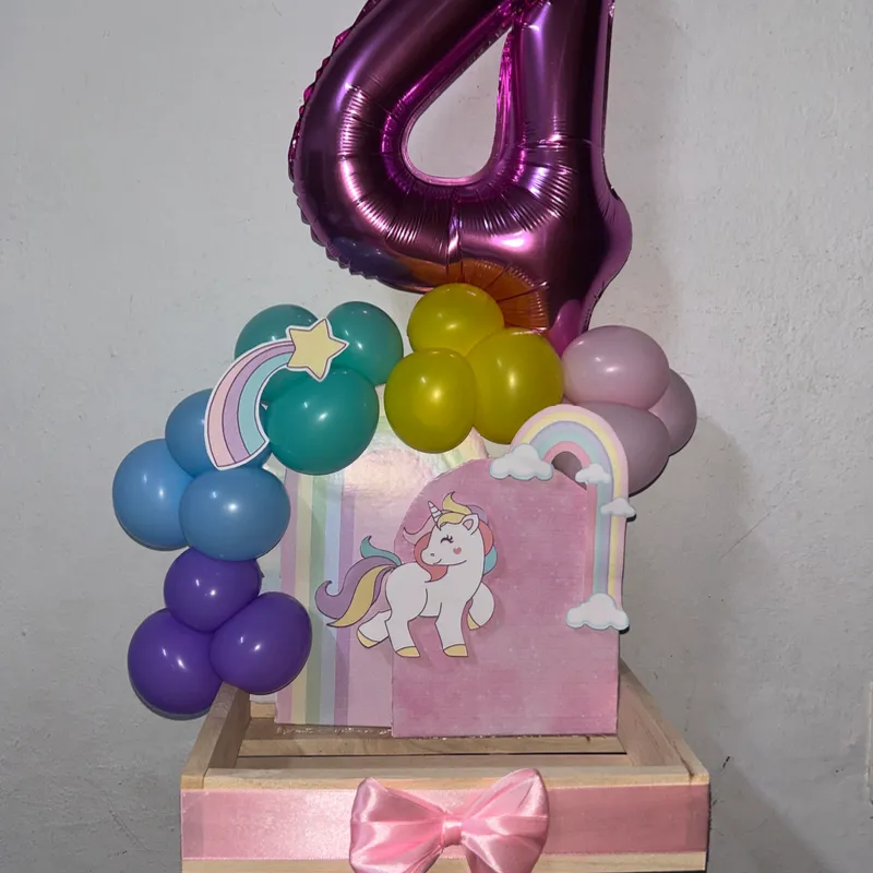Caja mediana decorada con globo metálico de número, globos de látex y fondo con relieve de la temática que desees
