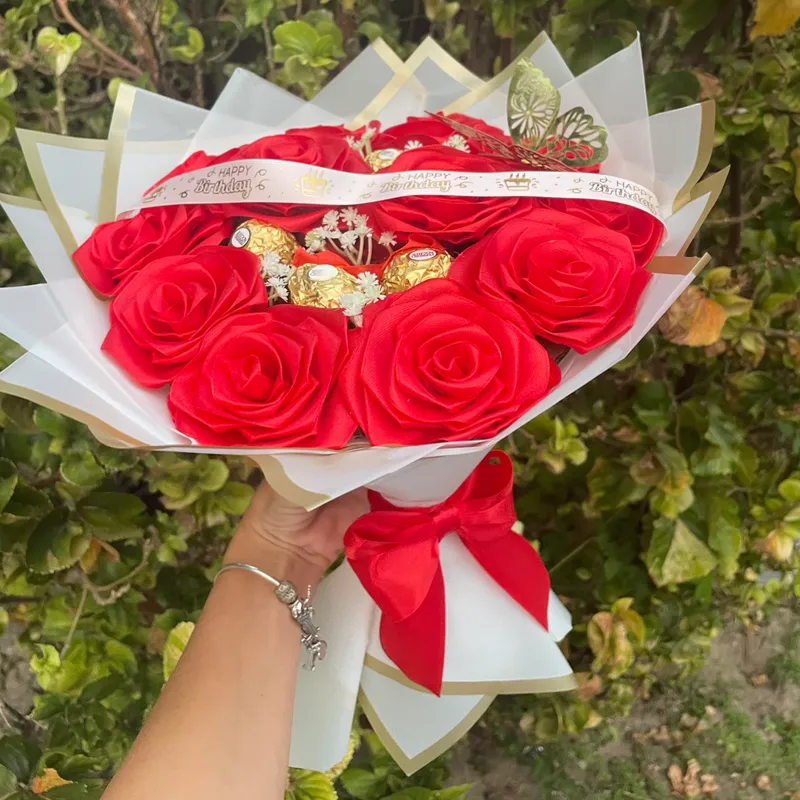 Ramo de 12 rosas eternas, 6 bombones Ferreros Rocher, cinta de HB, florecitas blancas y mariposa