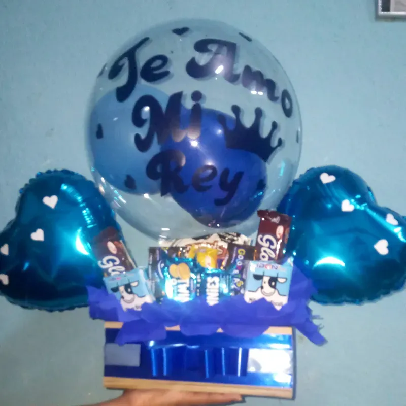 Caja decorada al gusto del cliente Globo burbuja con frace personalizada 2 globos de corazon de 10 pulgadas 10 confituras variadas. 4000💵