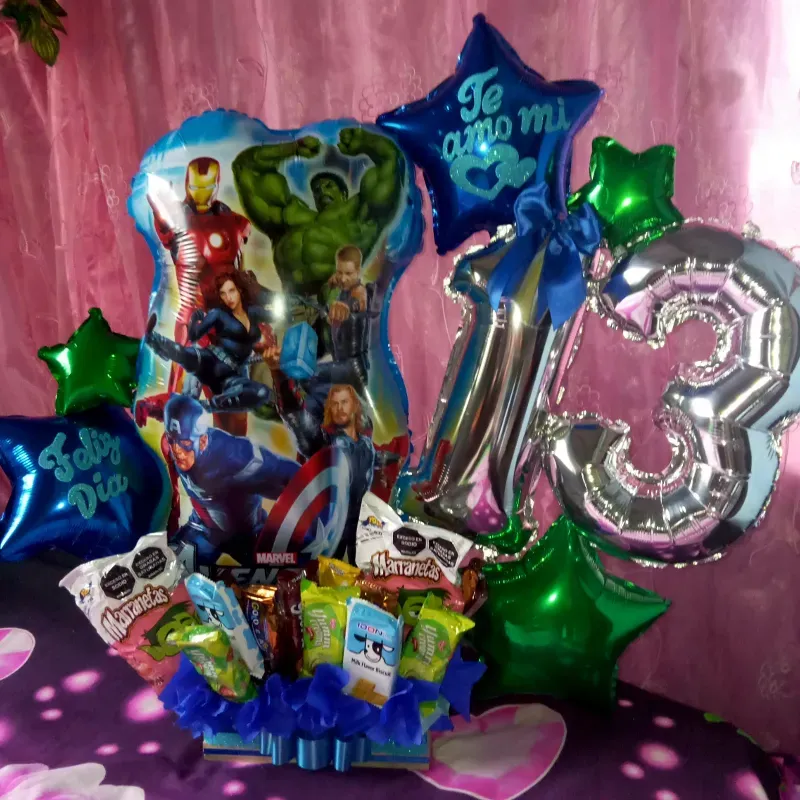 Caja de madera decorada Silueta de una tematica específica de 18 pulgadas . 3 globos de estrella de 10 pulgadas 2 estrellitas de 5 pulgadas 2 globos de números de 16 pulgadas 20 confituras variadas. 6200💵