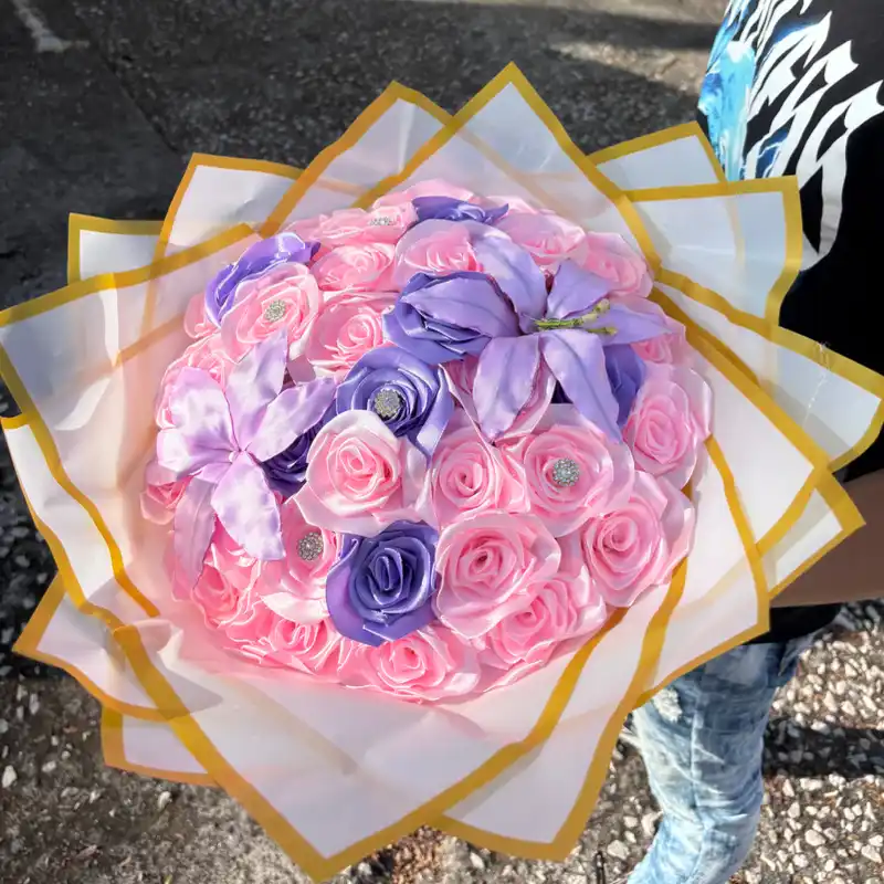 Ramo de 33 rosas 26 rosas rosas , 7 rosas lilas y 2 lirios Con perlas en algunas rosas y envoltura blanca