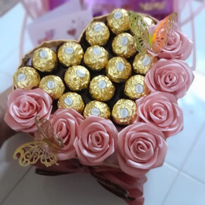 Caja en forma de corazón ♥ con rosas eternas y 17 ferreros