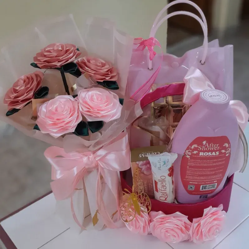 Ramo de flores y cesta con un estuche de colonia, gel de ba帽o y crema para la piel. Talco perfumado, jab贸n de olor y bombones ferrero de coco.