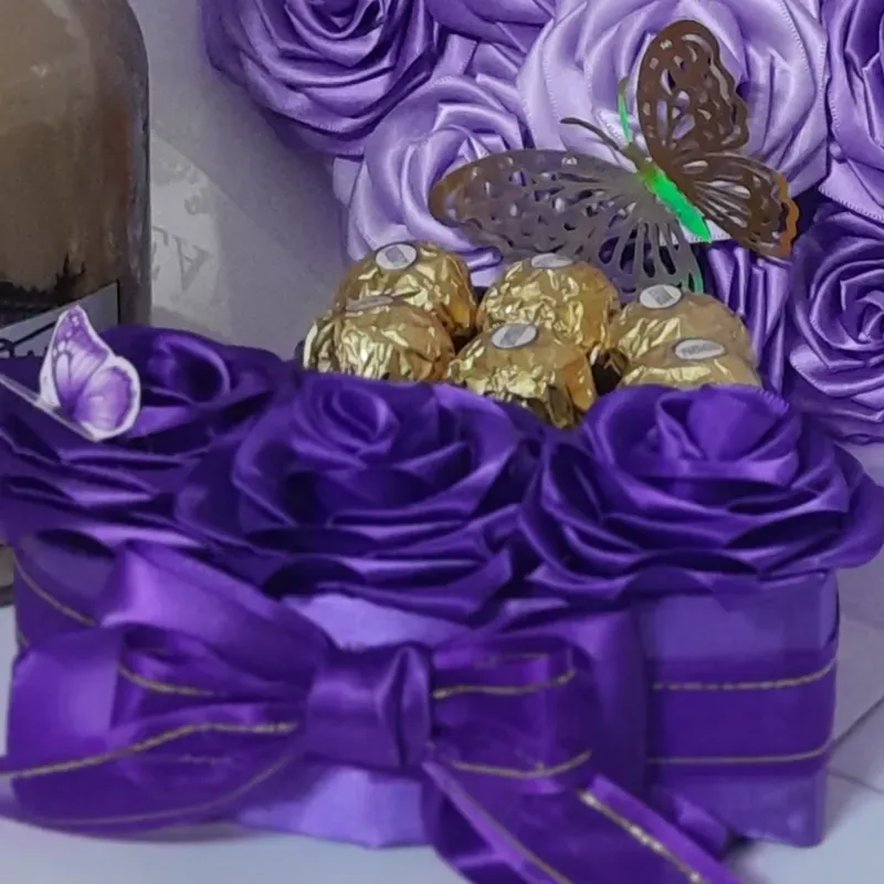 Caja en forma de corazon con 3 rosas eternas, mariposa y 7 bombones ferreros rocher